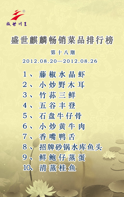 发布时间:2012-08-28 来源:九江市盛世川王餐饮管理有限公司 浏览次数:1823