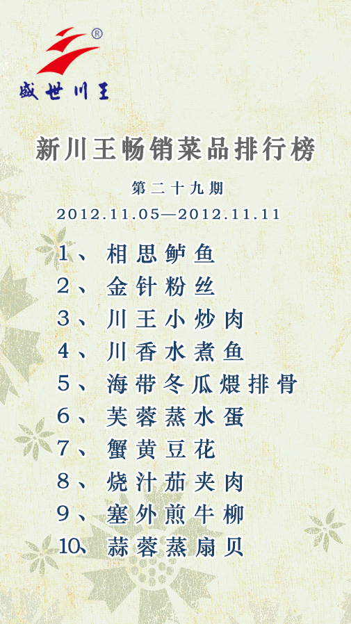 发布时间:2012-11-13 来源:九江市盛世川王餐饮管理有限公司 浏览次数:1759