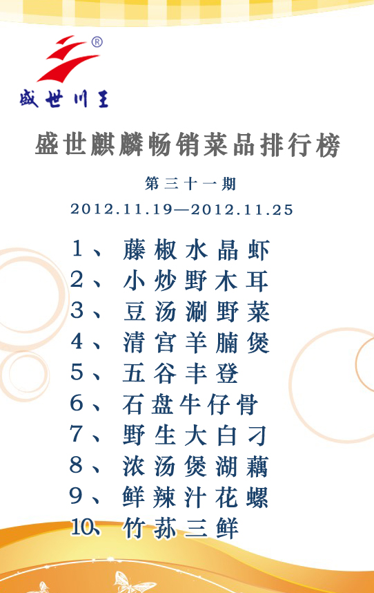 盛世麒麟畅销菜品排行榜第三十一期