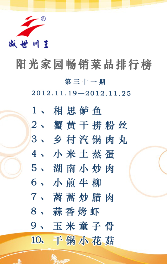 阳光家园大酒店畅销菜品排行榜第三十一期