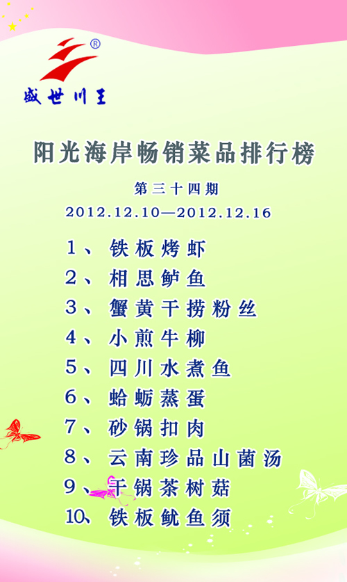 盛世麒麟畅销菜品排行榜第三十四期