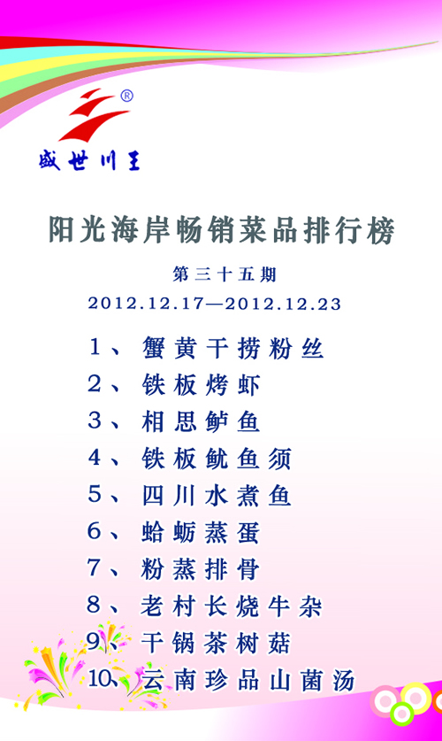 阳光家园大酒店畅销菜品排行榜第三十五期