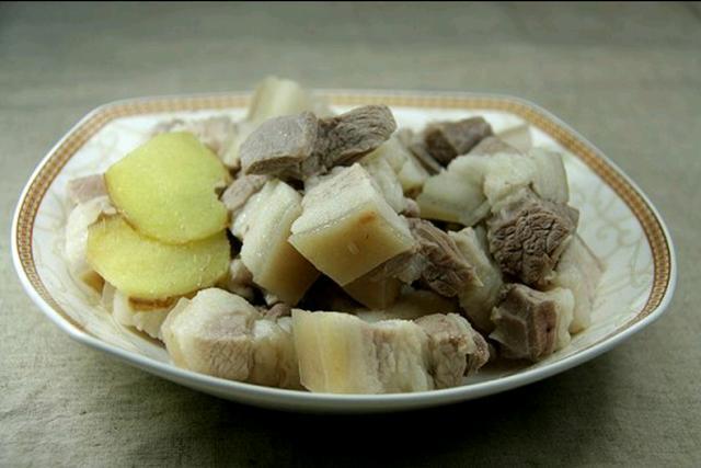 2、汤锅做一锅水,凉水下肉,盖上锅盖,待水开后撇去浮沫后捞出,肉汤保留,捞出的五花肉装盘备用