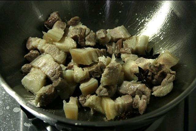 4、倒入五花肉不断翻炒出油脂,注意要不断翻炒以免猪油沾粘锅壁