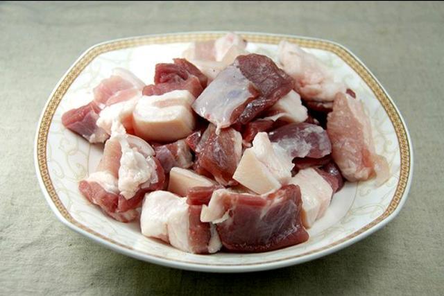 1、猪五花切成约2cm左右的块儿洗净备用