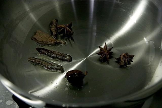 3、炒锅倒入适量油,撒入桂皮、八角和草果煸炒出香味