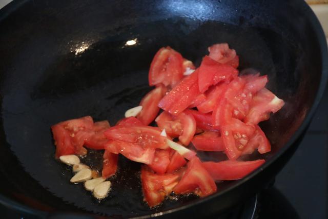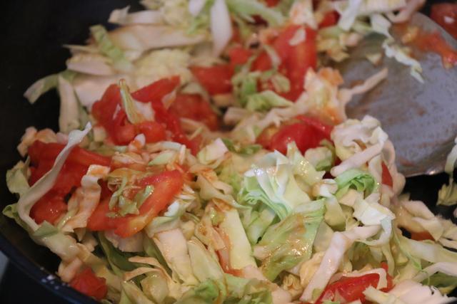 第二步:锅上火烧热加油然后下蒜片煸香,接着下西红柿片大火爆香,将圆白菜丝下锅大火翻炒最后出锅加盐调味,撒少许糖提鲜即可出锅。