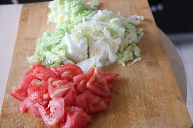 第一步:将圆白菜剥去外皮然后切丝洗净,西红柿洗净切片放在案板上,大蒜剥皮切片一起备用