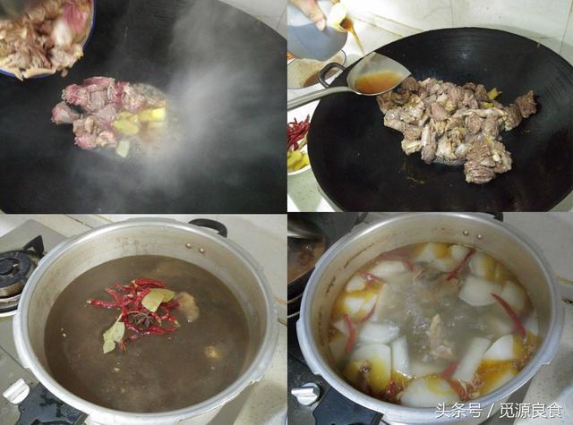 第四步:牛腩炒制煸香没有水分后,现在就将炒好的牛腩块倒进高压锅中,高压锅中给大半锅清水,然后放入八角、干尖椒、香叶开始高压炖煮,高压锅上汽后在煮12分钟,12分钟后关火待高压锅的气体都没有了,可以安全开锅的时候牛腩就已经大致软烂了