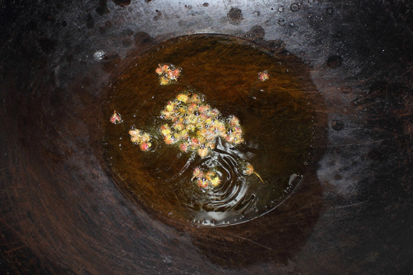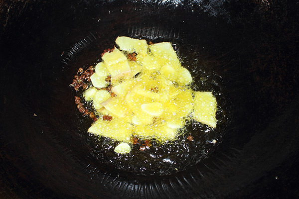 炒锅烧热,倒适量油,油量比一般炒菜用量大些,一倍左右,先放花椒炸一下,然后放姜蒜爆香