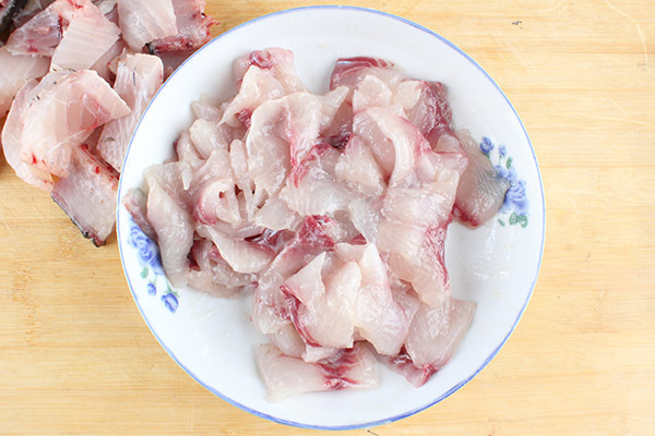 草鱼收拾干净,贴着脊骨将两面鱼肉片下来,去皮片成薄片,用腌鱼料抓匀腌上,