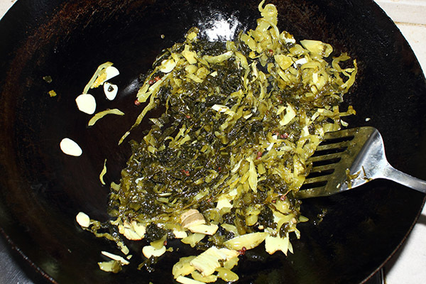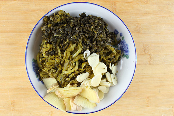 这里的酸菜不是东北酸菜,而是四川酸菜,别搞错了。现在的酸菜不够酸香,味道薄,所以一定要切丝,这样煮的时候能让酸味释放的更充分一些。