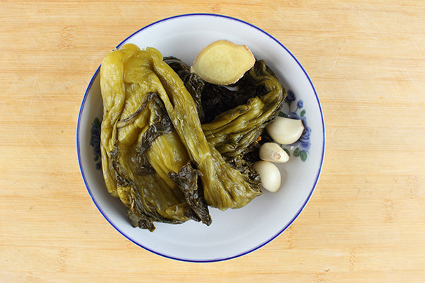 酸菜顶刀切细丝,姜切大片,蒜切厚片备用