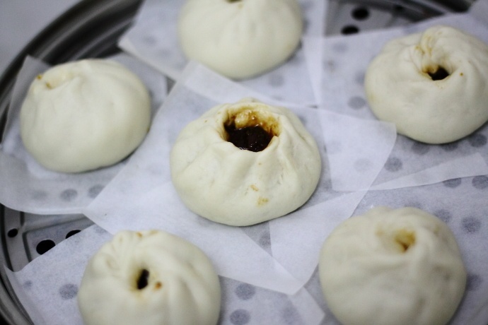 14、按上述方法做剩余面团,做好的包子用油纸垫上放蒸锅中