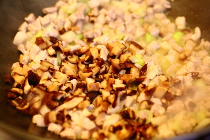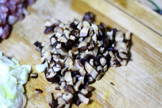 2、干香菇洗净后用温水浸泡3小时以上,去掉多余水份切细丁