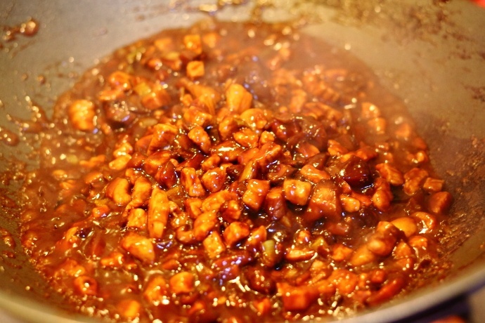 8、炒出酱香味后,加入白糖和耗油一起翻炒至肉熟透关火