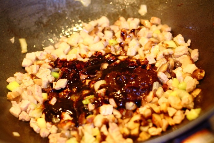 7、加入甜面酱和黄豆酱一起小火翻炒