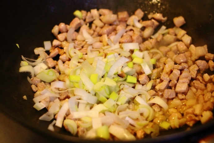5、肉炒至变色后加入大葱一起翻炒