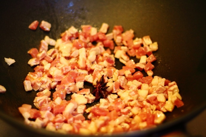4、锅里放少许油,加入八角和猪肉一起翻炒