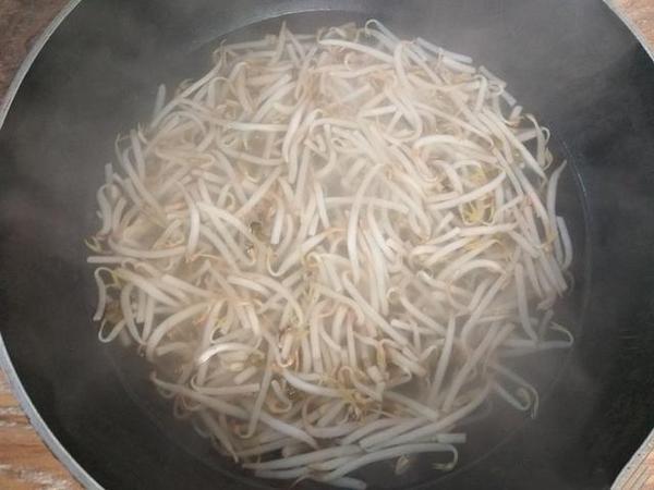 2、豆芽放入锅中焯水,同样加入盐煮软后马上捞出,要保持口感脆的,然后把粉丝放入锅中煮软然后捞出控干水分;