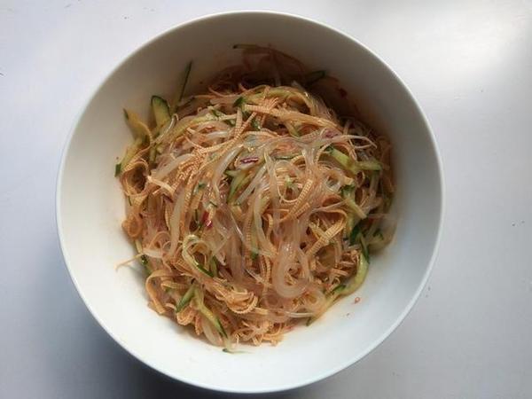 备料:豆腐皮、黄瓜、粉丝、辣椒、豆芽