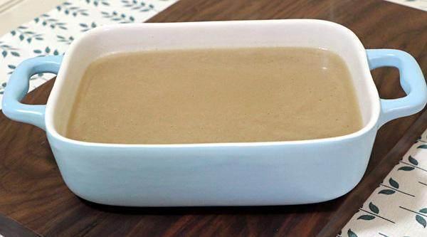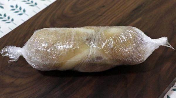 4. 取保鲜膜,把还有余温的猪肘子包卷起来成圆柱体,如果你喜欢方形也可以用模具压成方形。放进冰箱保鲜一个晚上。第二天拿出来切片,并做好酱料:蒜泥和酱油混合物
