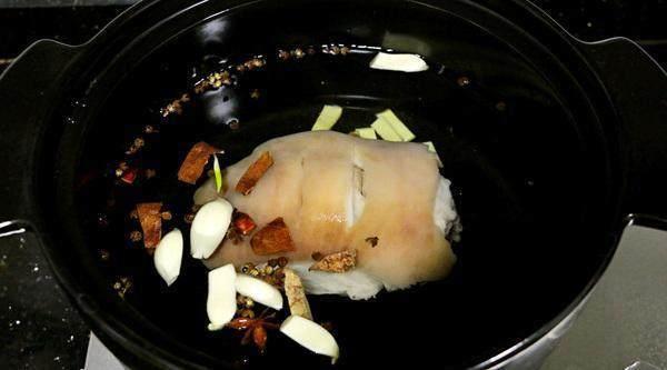 然后放进高压锅或者汤锅,加入各种配料:姜片、蒜片、八角、花椒、陈皮、料酒,清水加至微高于猪肘子。