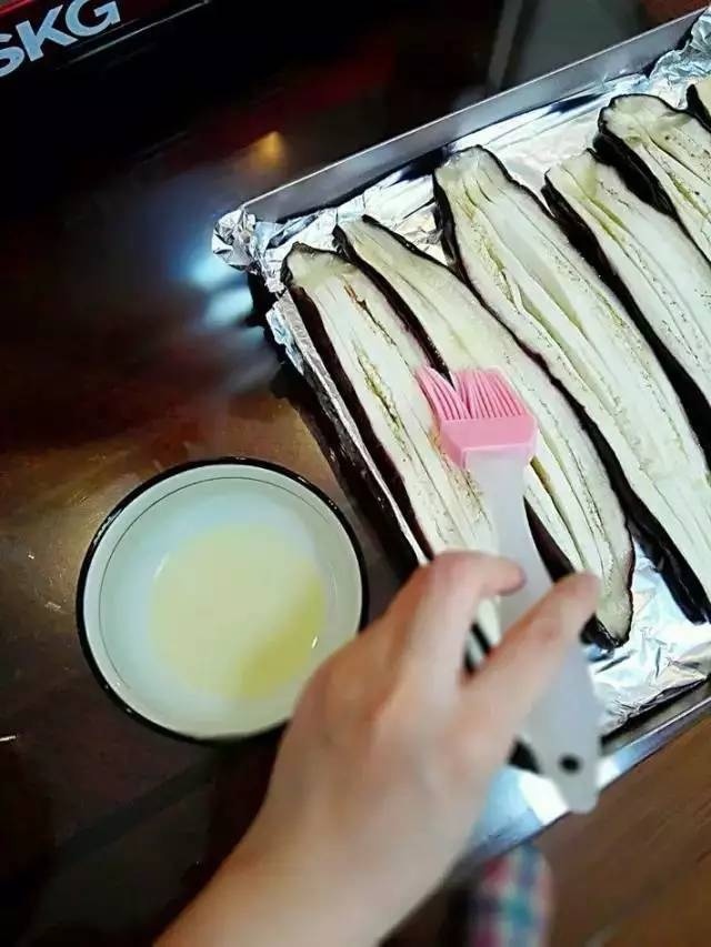 蒸好的茄子放入铺了锡纸的烤盘里,三根茄子勉强放下,表面刷一层油。