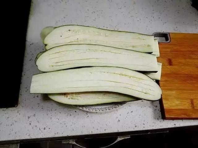 茄子对半切开,竖着划几刀,不要切透了。