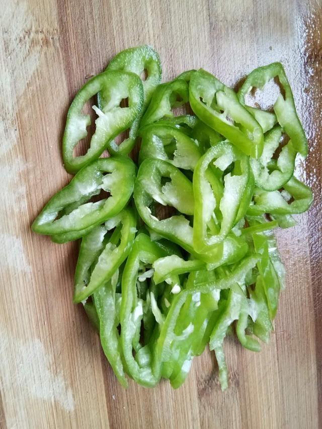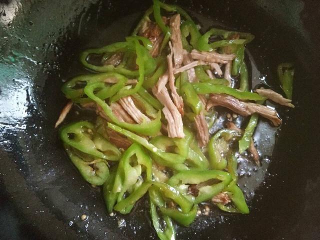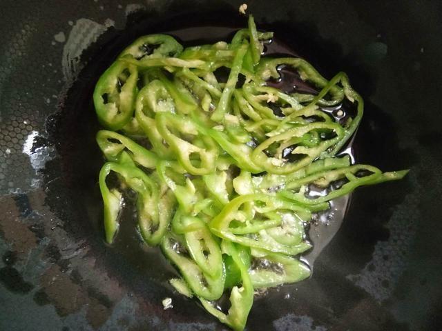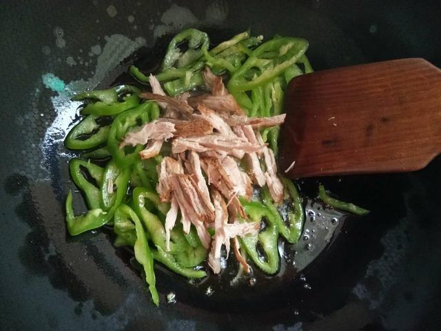 二、热锅,先将青椒爆炒一下。加入一些肉末,(家里没有肉末加了过年时自己煮的瘦肉)继续翻炒,翻炒均匀了添加盐和生抽白糖。