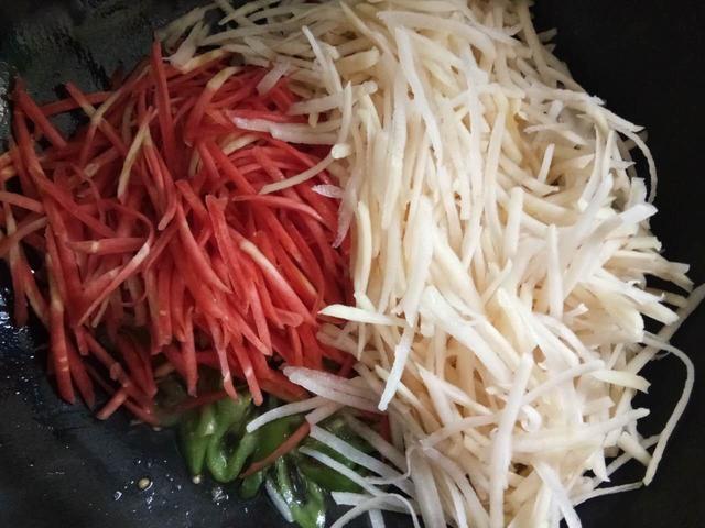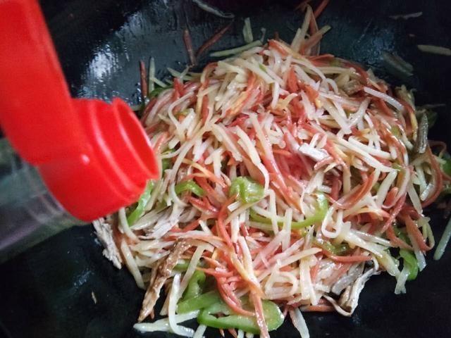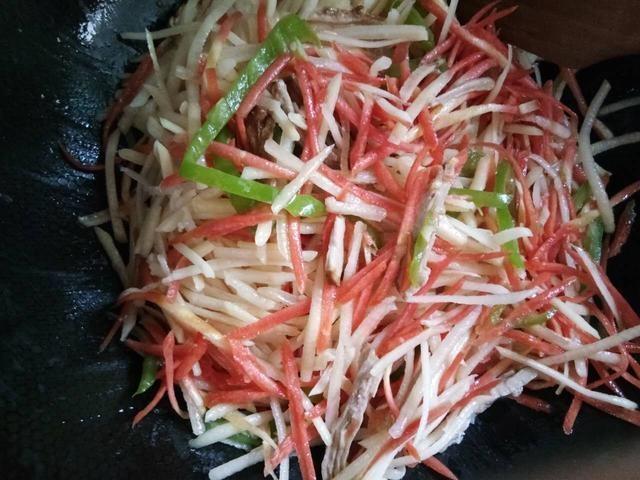 三、将土豆丝和胡萝卜丝一起倒入,加少许水炒匀快速翻炒。起锅之前倒入一点醋,翻炒均匀就好。