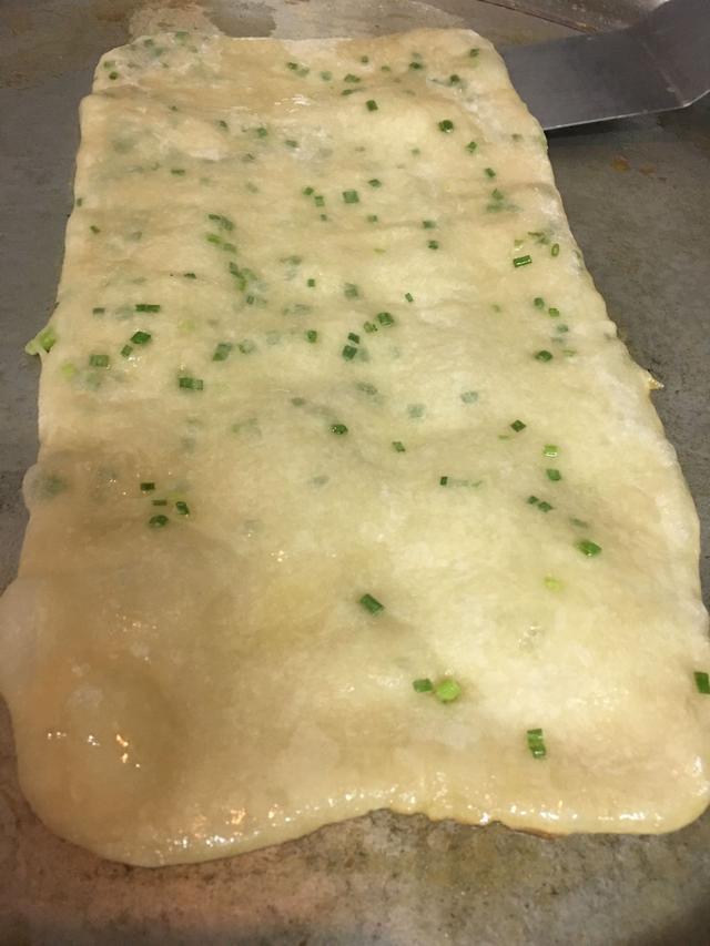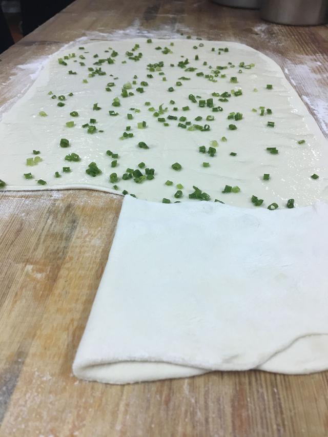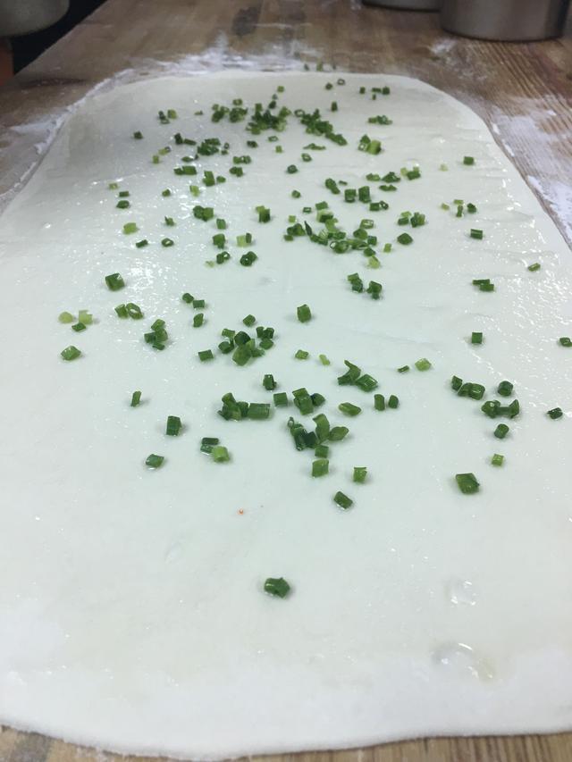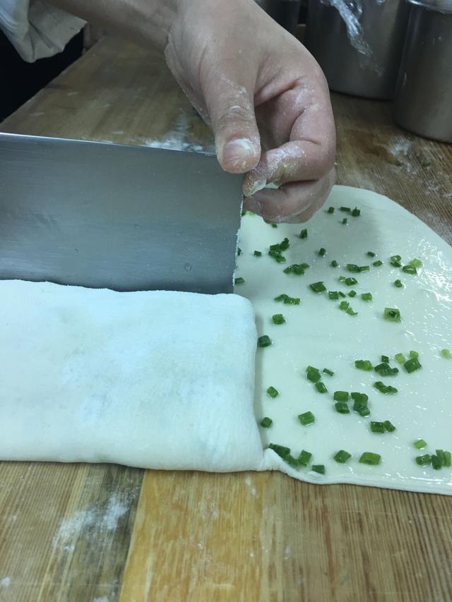 第二步:醒发好的面团在案板上擀成长方形片,表面刷油然后撒盐,将葱花撒在表面,最后用刀在面饼的右下角划一刀叠起,接着再顺上面切一刀再叠起,一直叠到最左侧,然后擀平放进饼铛里烙成两面金黄即可切块。