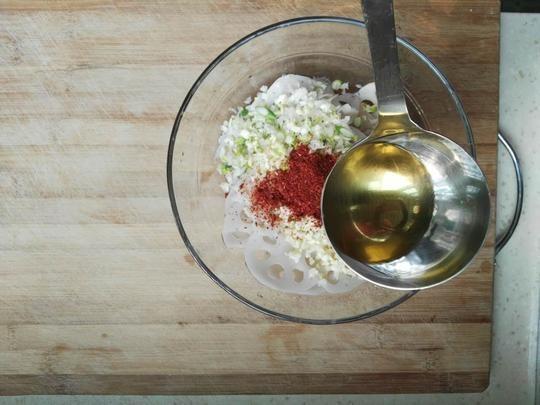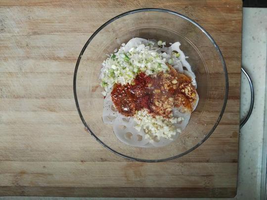 莲藕300克,大蒜5瓣,葱一条,辣椒粉小匙各一小匙,陈醋一大匙,生抽一大匙,白糖一小匙,芝麻油0.5小匙,鸡精少许,盐适量,油两大匙
