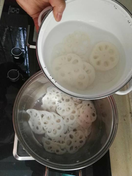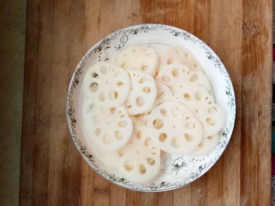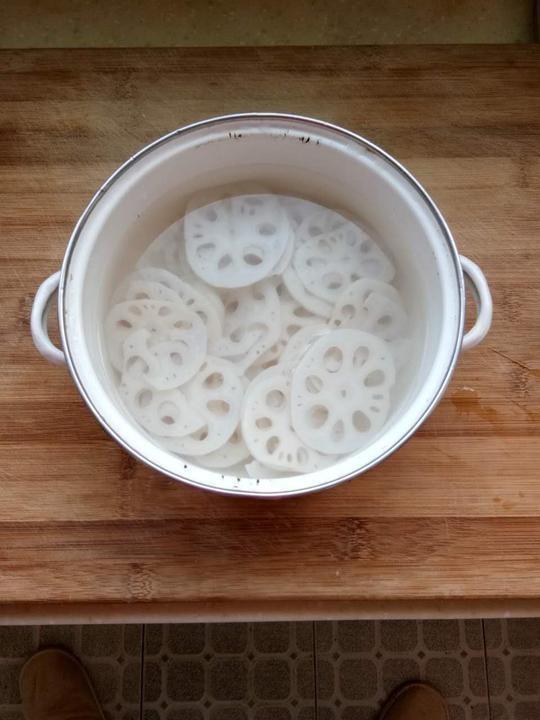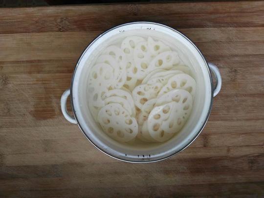 3、藕片用清水浸泡一会并洗去表面的淀粉,焯烫好后立即放入冷水中过凉,这样会使口感更脆;