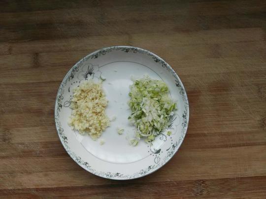 02、将大蒜去皮切碎成末,葱洗净切碎,待用。