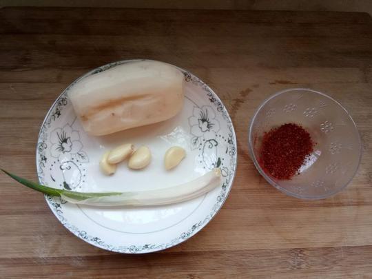 01、准备好原料;莲藕300克,大蒜5瓣,葱一条,辣椒粉2小匙