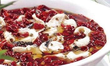 3、漏勺放入烧沸的高汤里,把鱼片顺次放入漏勺,等到最后放入的一片鱼肉变色,这时候鱼片大概有八成熟,捞出沥水,倒入垫有黄豆芽的盆中,铺上黄瓜片,撒上干辣椒段、青花椒粒,再倒入烧到八成热的红油900克激香即可。