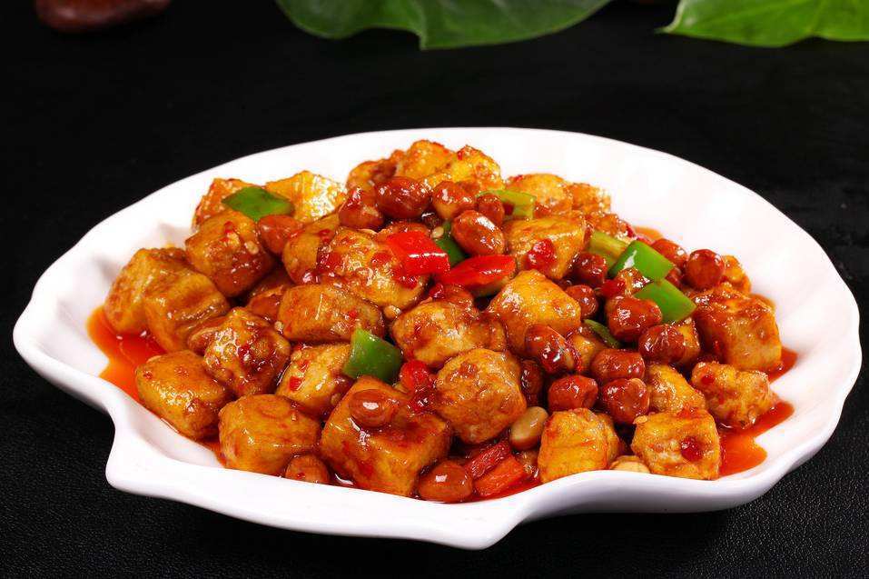 宫保豆腐又称为宫保豆腐丁、宫保豆腐块,是宫保鸡丁的衍生菜品之一,为四川省特色菜品。宫保豆腐通常由老豆腐、干辣椒和花生米等食材炒制而成。成菜后,色泽红润,口感香辣。