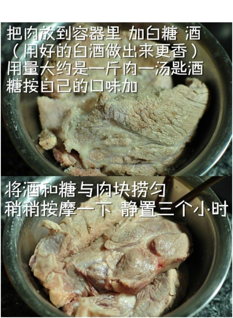 ❥把肉放到容器里,往里加入适量的白糖和酒,比例是一斤肉,一汤匙酒这样。把调料跟肉拌匀,稍稍按摩一下,使其更快渗入,然后静置三个小时等待入味。