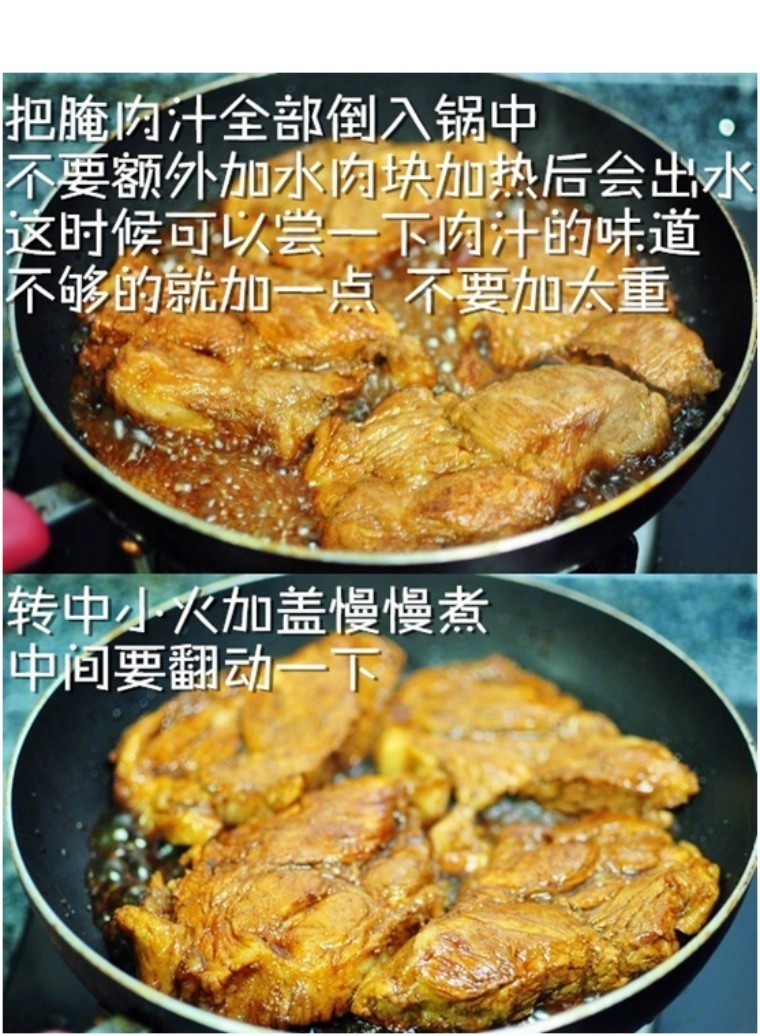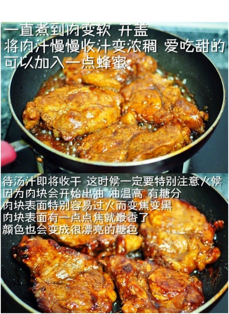 ❥昨天和肉块一起关禁闭的酱汁不要乱倒掉,把它一股脑加进锅里,转中小火和肉块一起煮。记得经常翻动一下,不要等酱料烧干了都不知道,还疑惑为什么同样的步骤别人做出来的食物那么好吃,自己做的就是黑暗料理。