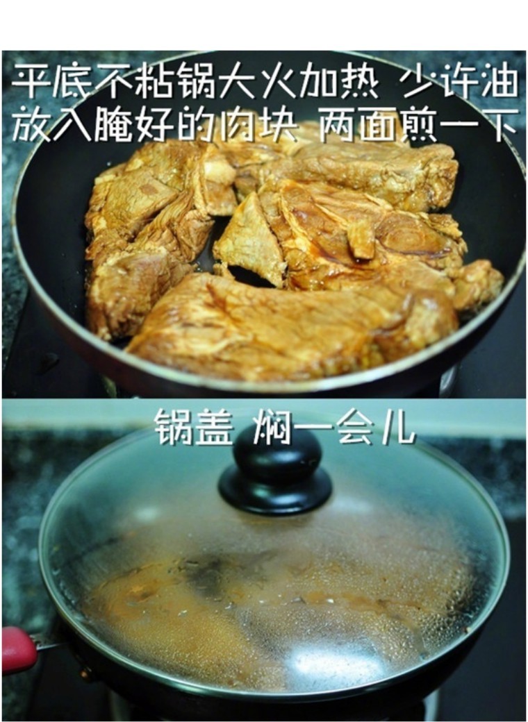 ❥第二天,我们把肉取出来,放进热了油的平底锅里煎一下,翻个身,再把背面也煎一下。然后盖上锅盖,焖煮一会儿。