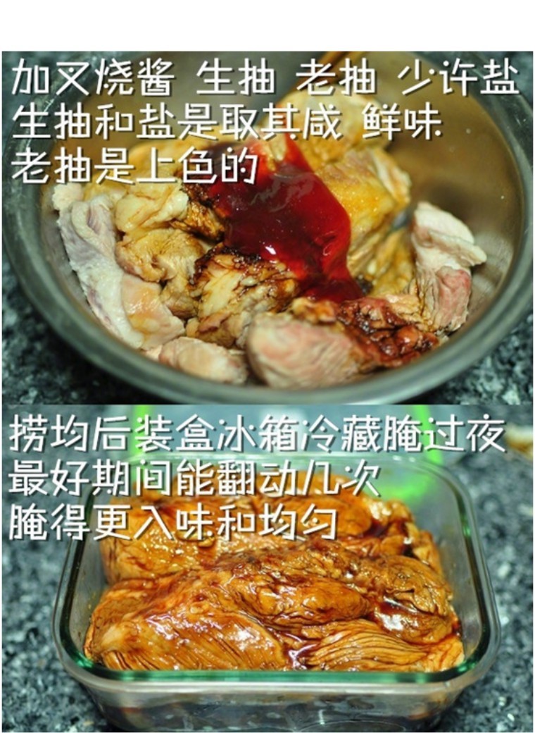 ❥接着加入适量叉烧酱、生抽、老抽、盐,拌匀后装起来放进冰箱里冷藏,让酱料和肉单独呆一晚上,期间最好能去翻动几次,监督它们到底有没有和睦相处。
