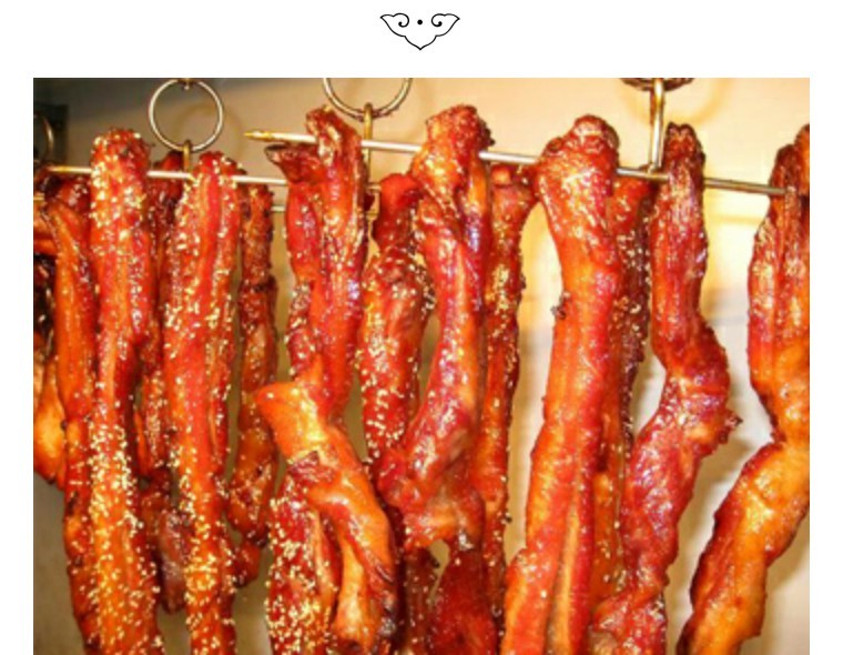 如果说,猪肉制品有偶像选举的话,我一定毫不犹豫地给叉烧打call!就是猪肉脯也要靠边站!叉烧乃广东特色肉制品,是把腌渍后的瘦猪肉挂在特制的叉子上,放入炉内烧烤。好的叉烧肉质软嫩多汁、色泽鲜明、香味四溢。当中又以肥、瘦肉均衡为上佳,称之为“半肥瘦”。
