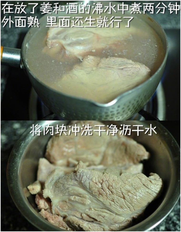❥ 煮一锅开水,倒入米酒,放入姜片,再把肉块放进去煮个两分钟,不用煮熟透,这只是初步去腥固型。煮好后就可以捞出,洗净,沥干水。